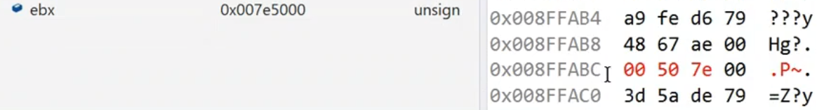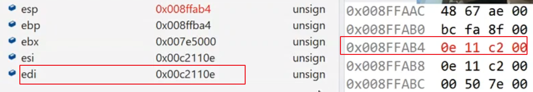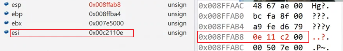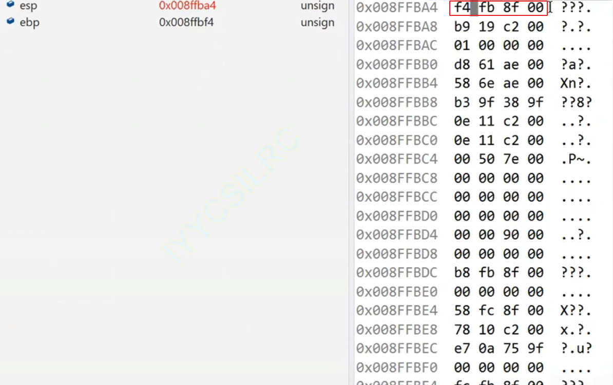 这里根据大小端字节序,VS是小端,要倒着读,是不是就是008ffbf4 ?正是esp的地址,是不是就说明我们确实把这个值给压进去了?