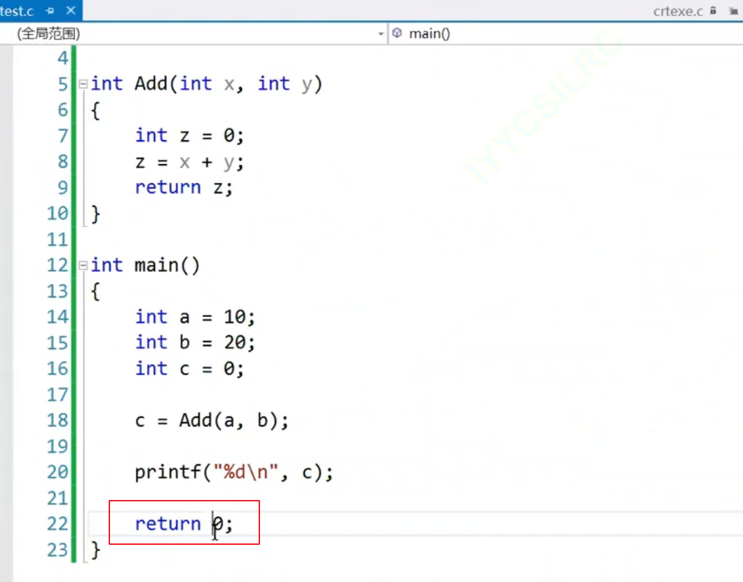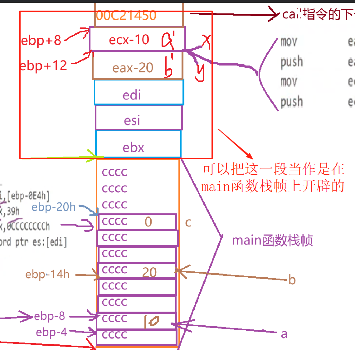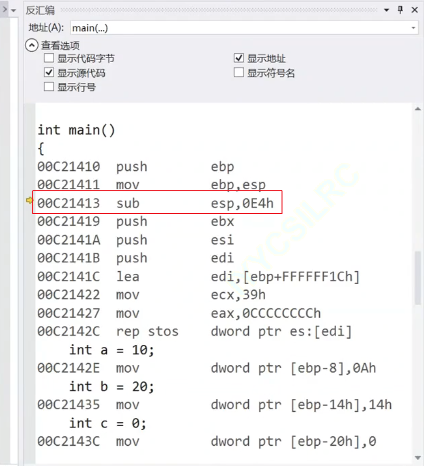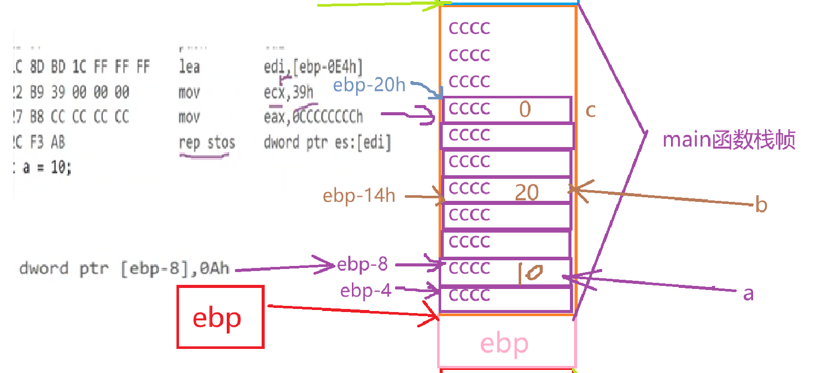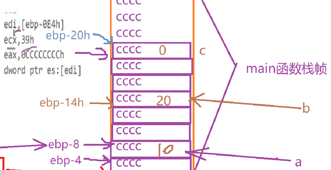 //4.将从ebp-24h到ebp之间ecx个4个字节的数字初始化为0xCCCCCCCC再回顾一下main函数的主要代码: