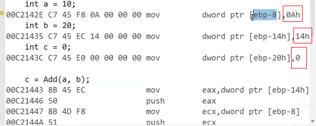 //将0Ah存储到ebp-8这个地址中,ebp-8的位置其实就是变量a