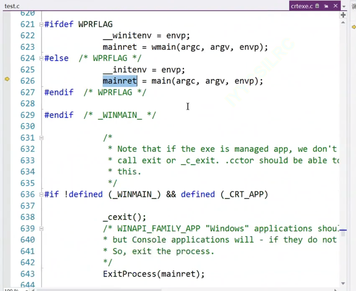 它又是被这个函数调用的,也就是说,这个mainCRTStartup调用了 __tmainCRTStartup, __tmainCRTStartup又调用了我们的main函数,main函数调用完有一个返回值(每一次我们调用完不是有一个返回值嘛),这个return 0 实际上就返回放到mainret里面去了: