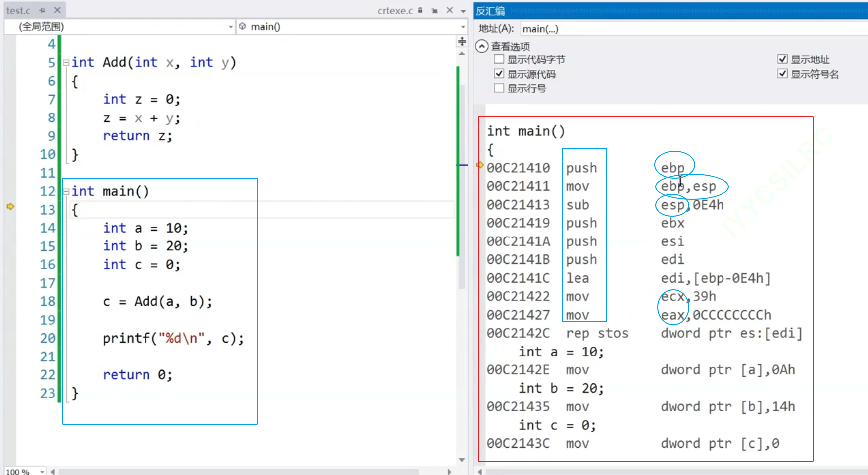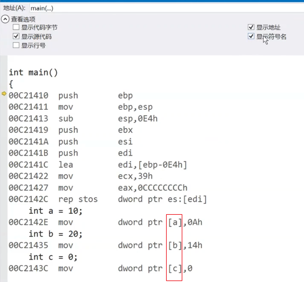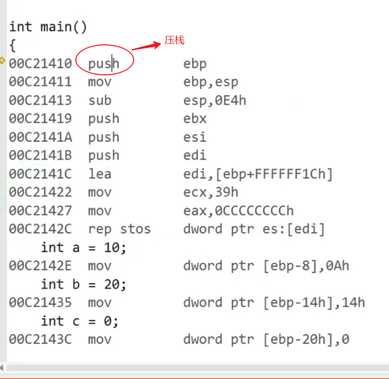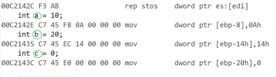 //将0存储到ebp-20h这个地址中,ebp-20h的位置其实就是变量c