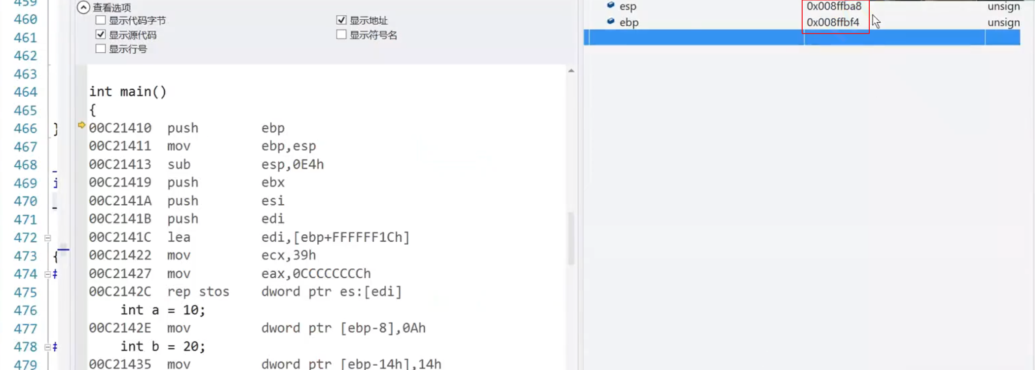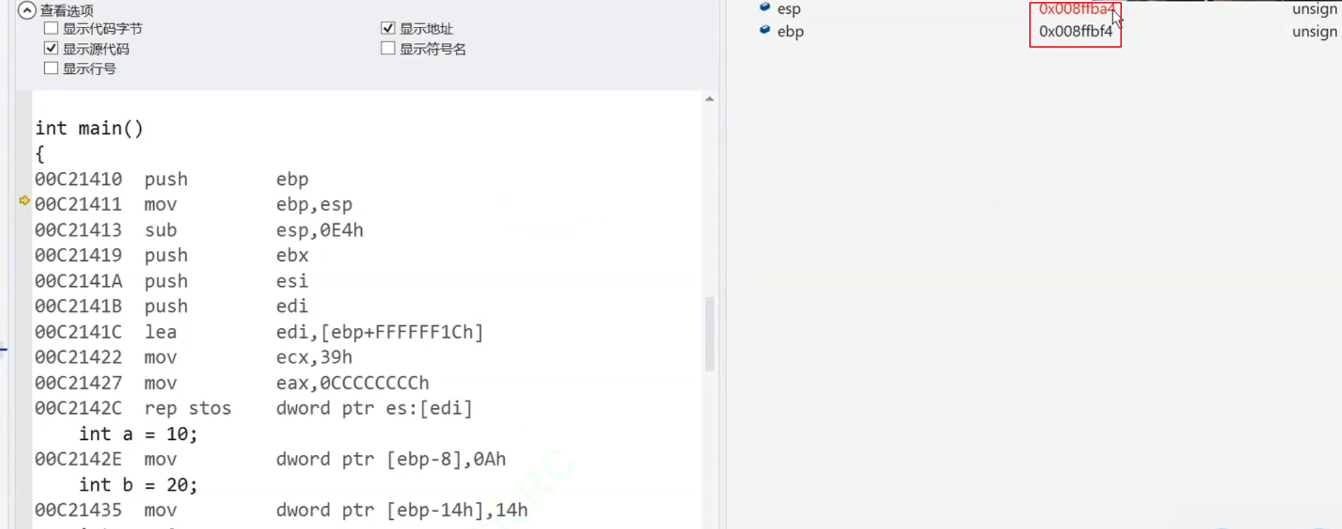 看到ebp、esp了吗?还记得它们是什么吗?没错,他们是寄存器,存放了地址,是用来维护函数栈帧的,一个是栈底指针(ebp),一个是栈顶指针(esp)。