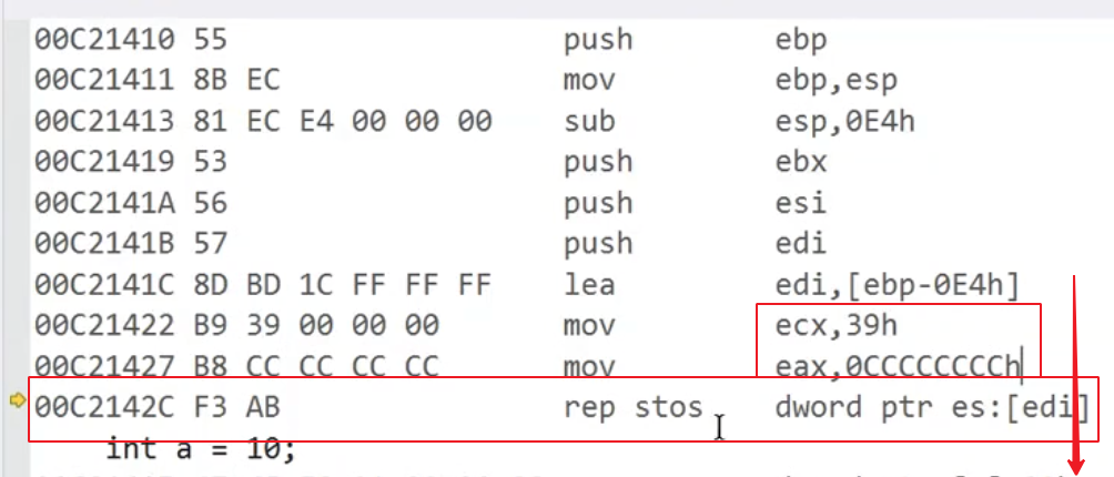 这四句话的意思其实就是把从edi开始向下的ecx的值39h这么多个dword(四个字节)的数据,每次都初始化四个字节,总共初始化ecx次,把它们全部初始化成cc cc cc cc,初始化eax里面的内容。