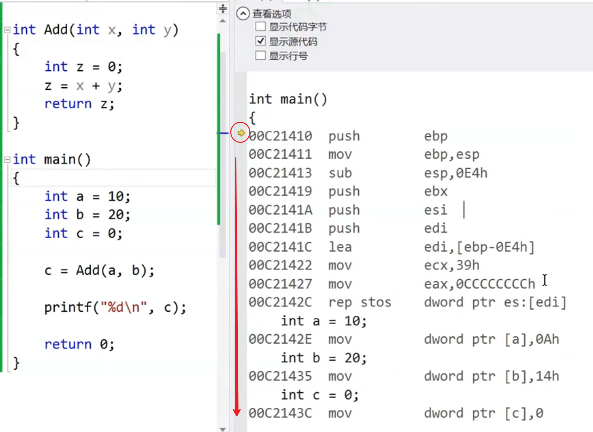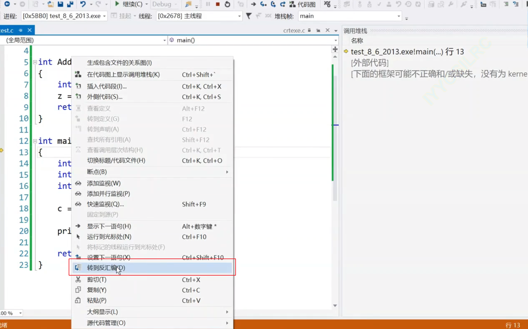 我们先调用这两个函数,调用到main函数再为main函数分配栈帧,到Add函数再为Add函数分配栈帧空间,说到这里,希望友友们对栈帧分配的思路有了一个大致的了解,下面我就带大家看看具体是怎么做的,我们还是结合截图——这边鼠标右击给到反汇编: