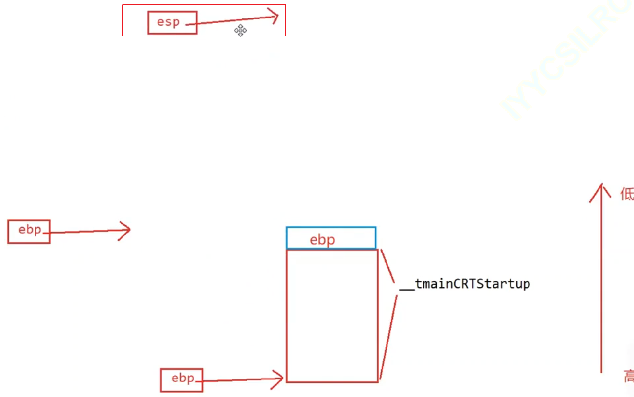 这个push就是压栈,刚才说了,栈区在使用过程中,从高地址指向低地址,空间在被消耗,如果再使用空间就相当于在上面使用空间,其实就是放数据的时候在顶上放数据,那么我们压栈也是压在栈顶上,如下图,此时栈顶的ebp存放的是栈底指针的值: