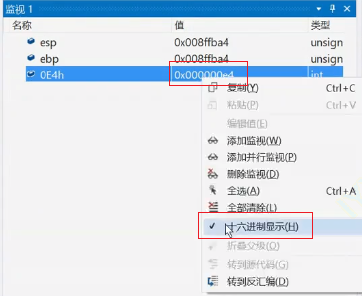 我们在监视输入0E4h,发现是一个十六进制的数,如果你想知道这个值是多少,我们右击关闭十六进制显示,发现这个值的十进制是228:
