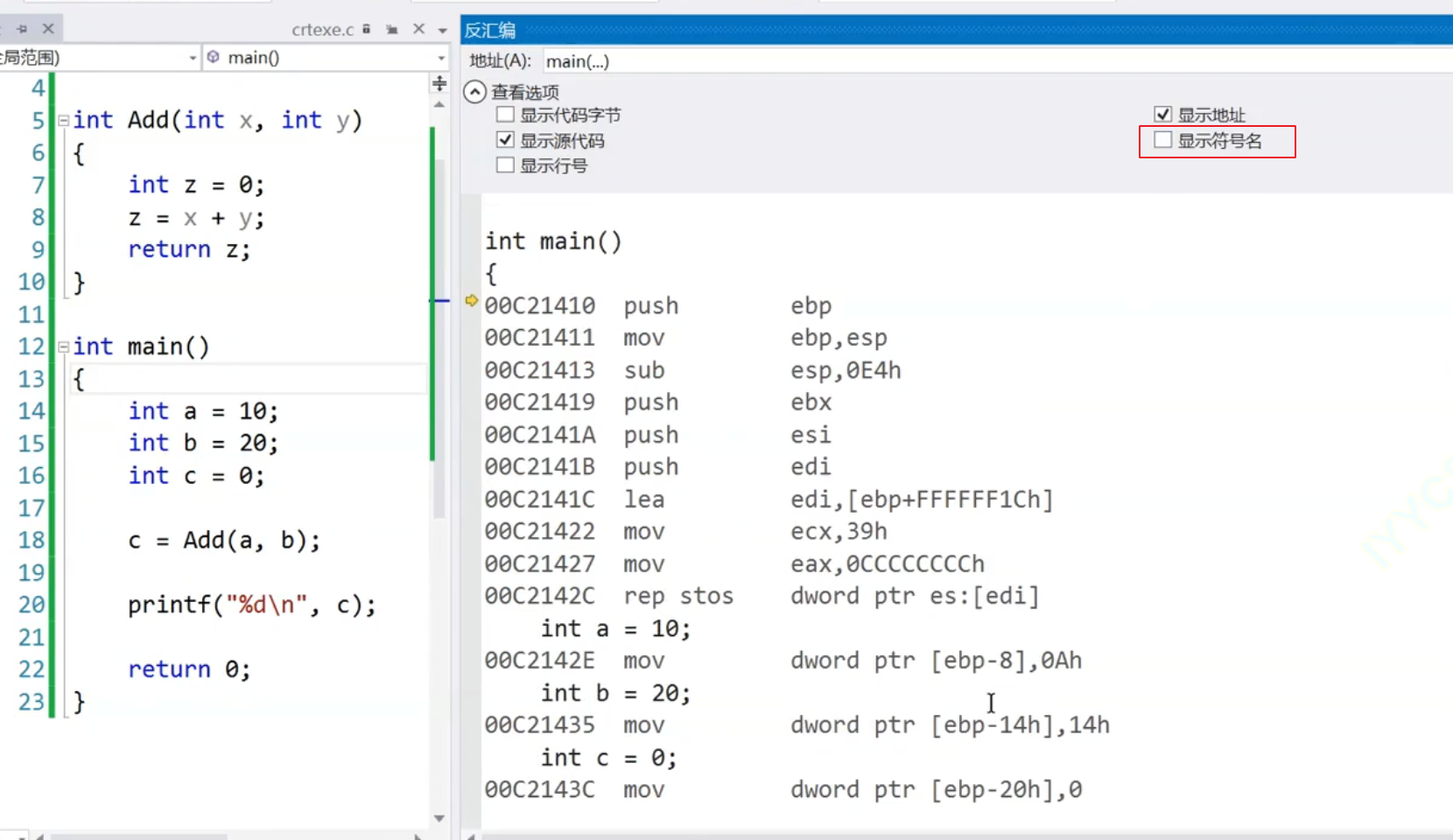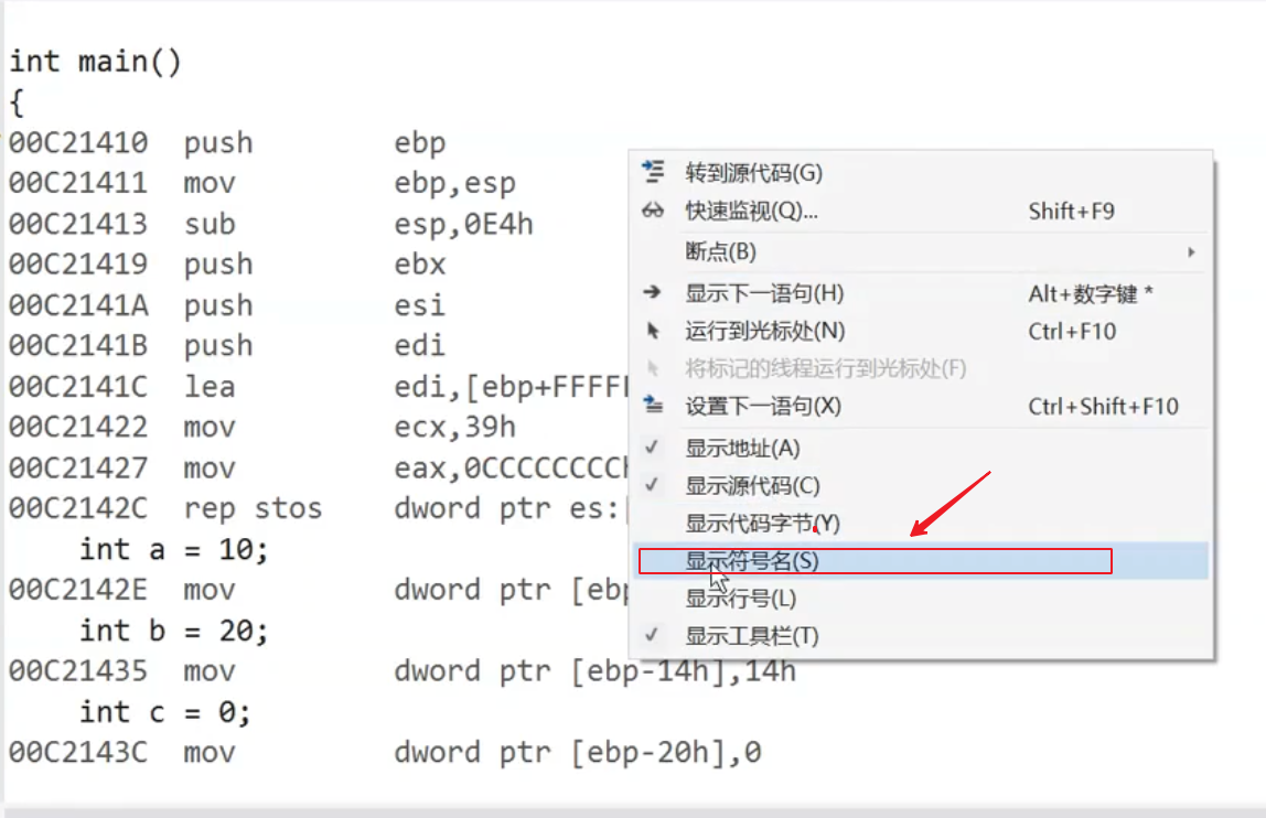 这里我们还要进行一个操作:转到反汇编之后要记得把显示符号名关掉,便于观察——