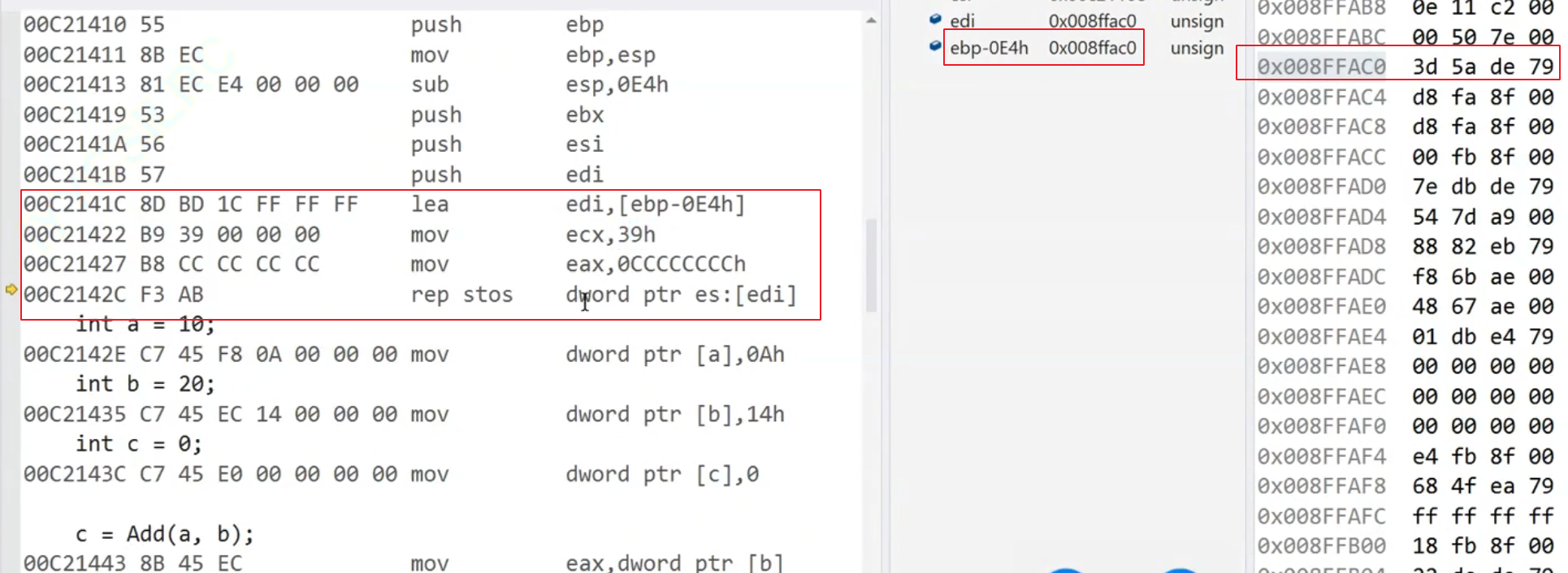 //将ebp-0ch到ebp之间ecx个4个字节的数字初始化为0CCCCCCCCh