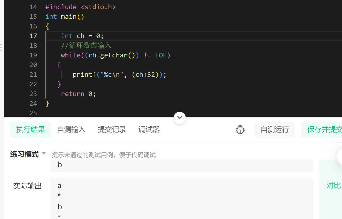 描述 实现字母的大小写转换,将大写字母转化为小写字母。多组输入输出。 输入描述: 多组输入,每一行输入大写字母。 输出描述: 针对每组输入输出对应的小写字母。