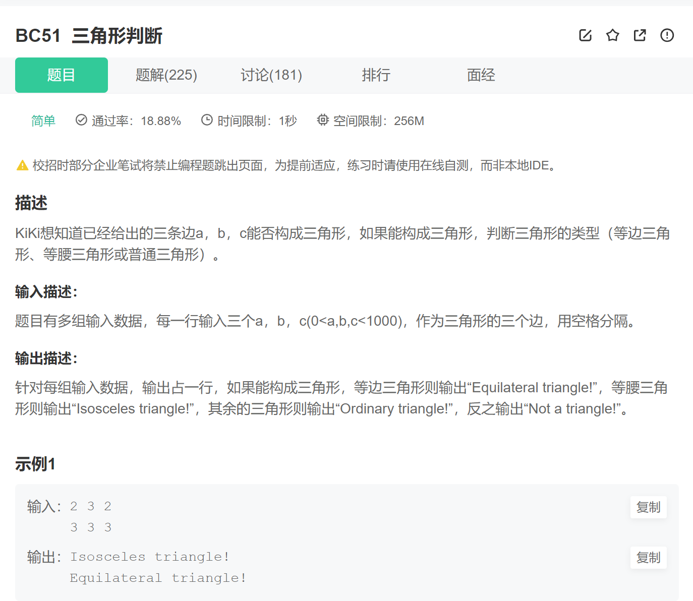这里就是搞清楚三角形的判断规则,并去一一穷举就行了,因为只有三条边: