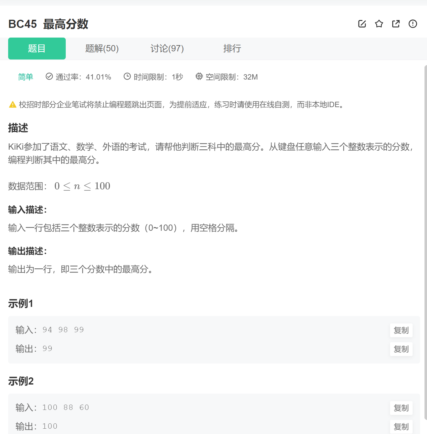 1.、多组输入; 2.、每组输入接受3个数字,求出最大值,因为成绩不能是负数,所以假设max期初是0 。