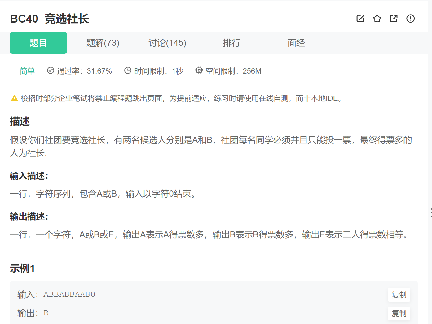 描述: 假设你们社团要竞选社长,有两名候选人分别是A和B,社团每名同学必须并且只能投一票,最终得票多的人为社长. 输入描述: 一行,字符序列,包含A或B,输入以字符0结束。 输出描述: 一行,一个字符,A或B或E,输出A表示A得票数多,输出B表示B得票数多,输出E表示二人得票数相等。
