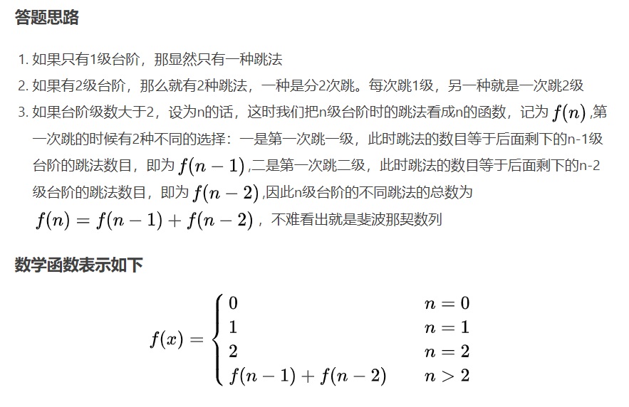 给大家拓展一个在《剑指offer》里面的题目,我们在介绍递归函数时提过两个问题:青蛙跳台阶和汉诺塔问题,这里我们就拓展一下这个青蛙跳台阶问题。