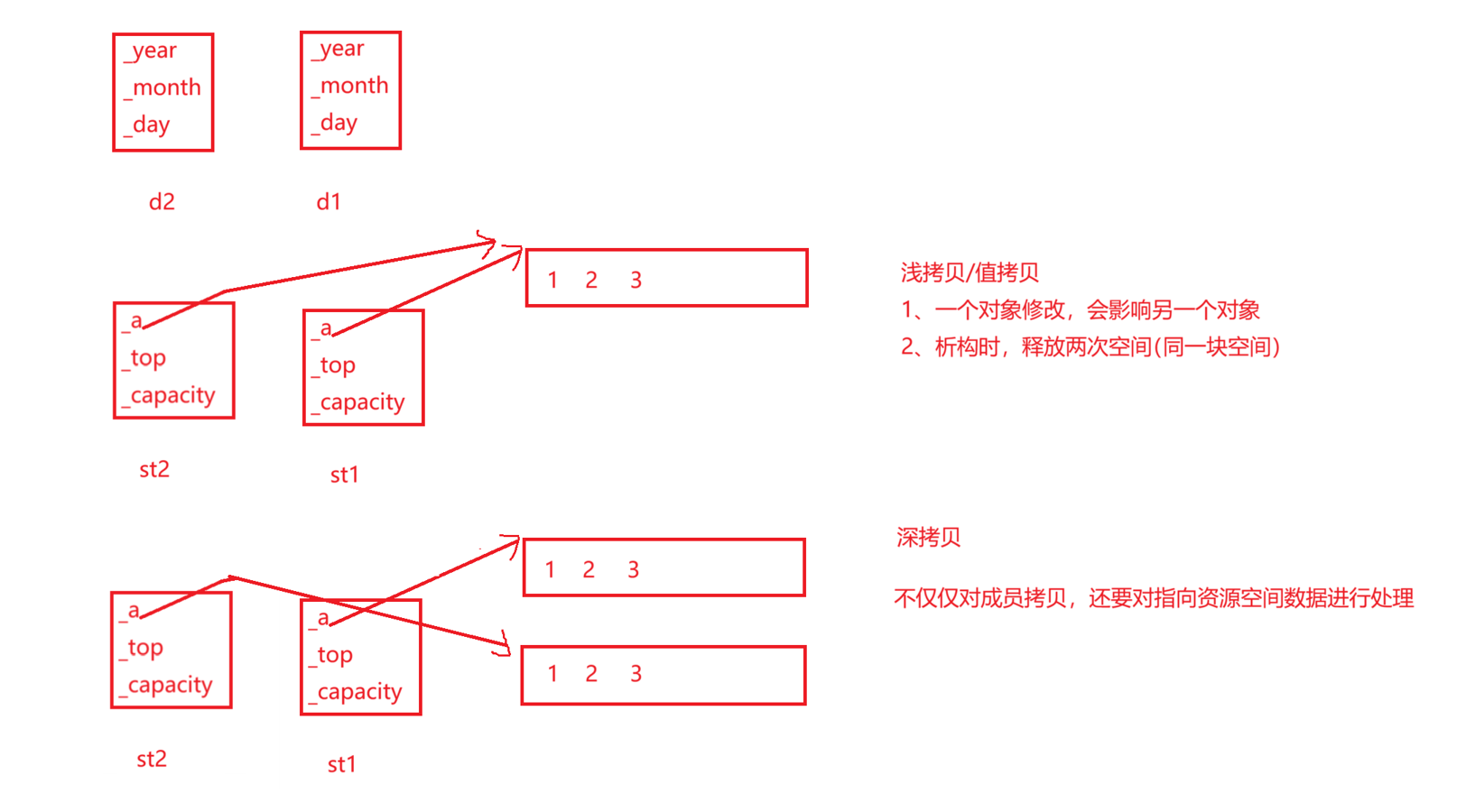 8、浅拷贝(值拷贝):对于日期类刚刚好,对于栈就不行了:
