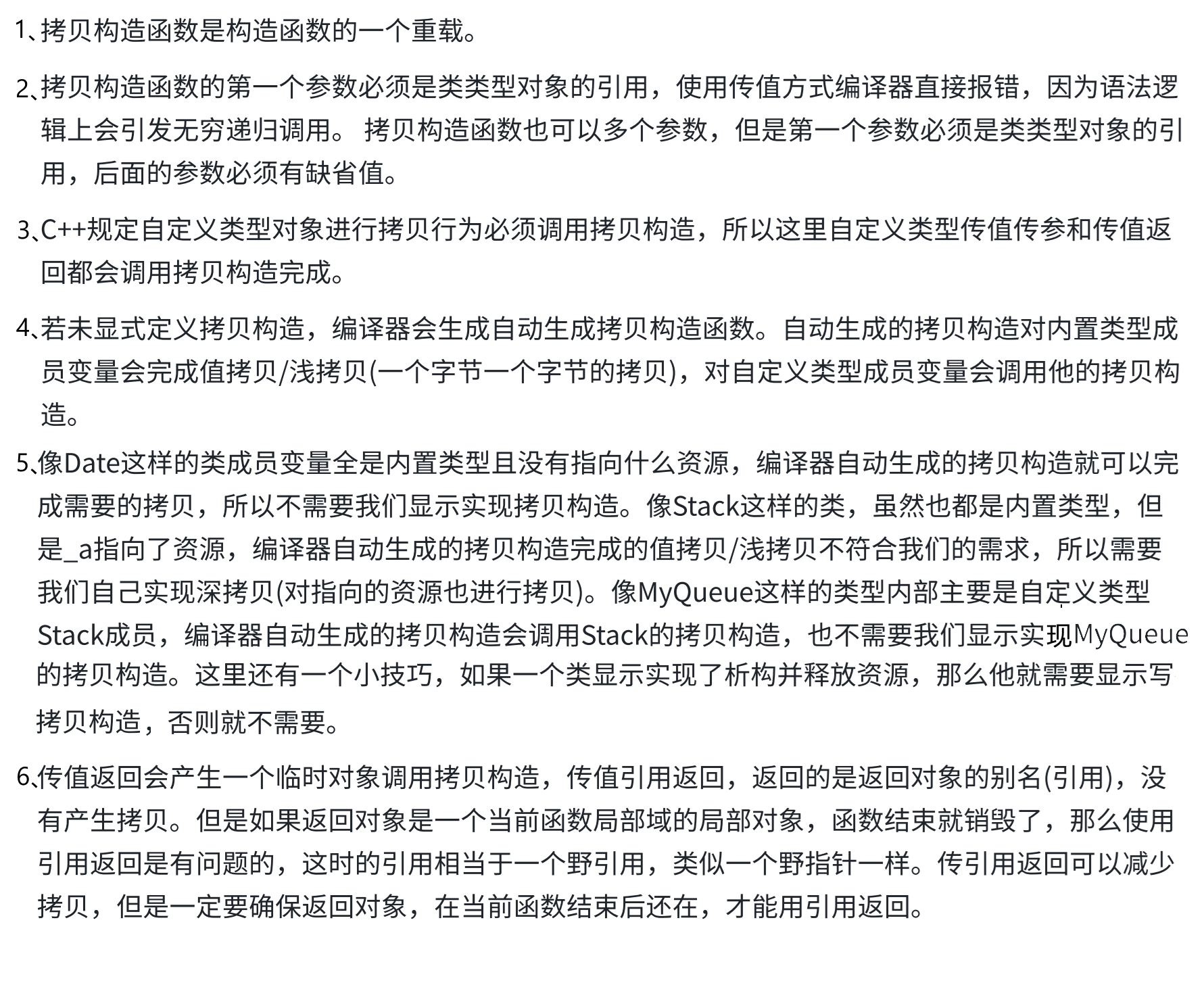 6、每次调用拷贝构造函数之前要传值传参(是一种拷贝,又形成一个新的拷贝构造,就导致了“无限递归”,传值传参要递归调用,递归调用就要调自己,如果每次都没调用到,就会不断地拷贝),因此我们要引用传参(形参是实参的别名,不用拷贝),也可以用指针,但是我们基本上不回去用指针,因为指针一用就变成普通的构造了,用指针可以是可以,但是用起来逻辑很怪,而且还要取地址,我们用引用传参更符合使用习惯和场景。