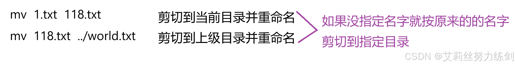 (1)视mv命令中第二个参数类型的不同(是目标文件还是目标目录),mv命令将文件重命名或将其移至一个新的目录中。 (2)当第二个参数类型是文件时,mv命令完成文件重命名,此时,源文件只能有一个(也可以是源目录名),它将所给的源文件或目录重命名为给定的目标文件名。 (3)当第二个参数是已存在的目录名称时,源文件或目录参数可以有多个,mv命令将各参数指定的源文件均移至目标目录中。