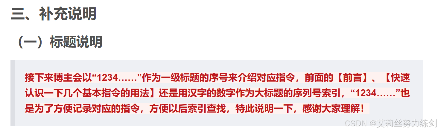 博主在上篇博客中曾经说明了一下【Linux指令篇】的标题功能,在构思【Linux指令 (二)】和【Linux指令 (三)】的时候博主发现自己太草率了,所以在此再修正一下:指令依然会以阿拉伯数字“1234……”作为几个一级标题的索引序列号,但是因为会穿插很多操作系统的理论,为了保证能够将真正的干货输出给大家,必须要结合Linux操作系统的理论,鉴于这部分知识点整理之后的特殊情况,艾莉丝很可能不能保证正文部分连续的“1234……”的一级标题了,像上篇文章这样——