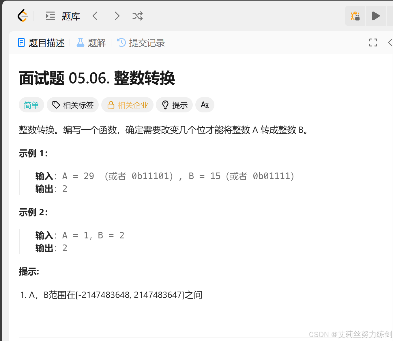 力扣题解链接:用异或、右移操作轻松搞定【整数转换】问题
