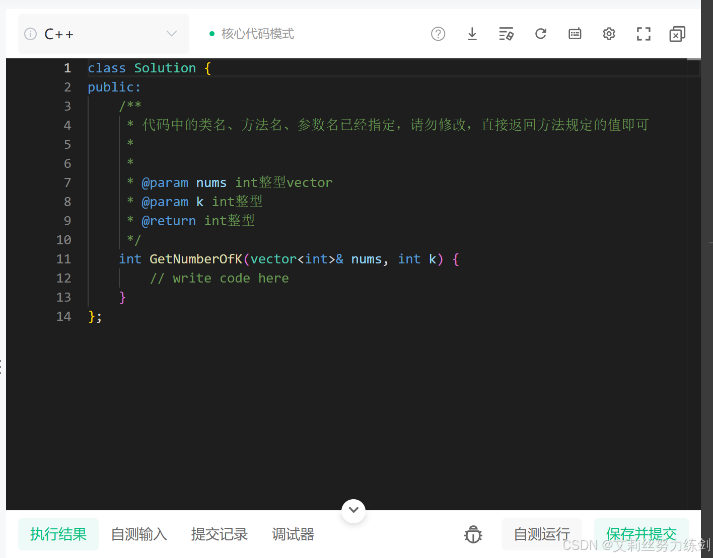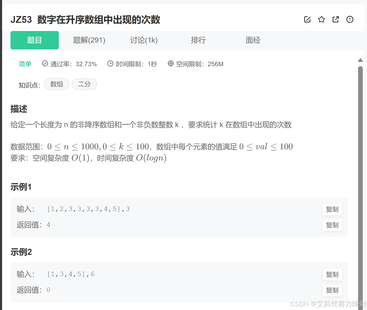 我们的思路就是,两次二分查找,左边界查一遍,比k小,left就mid+1,比k大,right就mid-1;右边界加上nums[mid]刚好等于我们要找的k这个范围,同样——比k小或者等于k,left就mid+1,比k大,right就mid-1。因为是接口型,我们不用自己输入输出,直接return我们的结果——左边界和右边界二分查找完,我们定义一个新变量,返回就返回右边界-左边界+1,就是我们要的数字在升序数组中出现的次数。