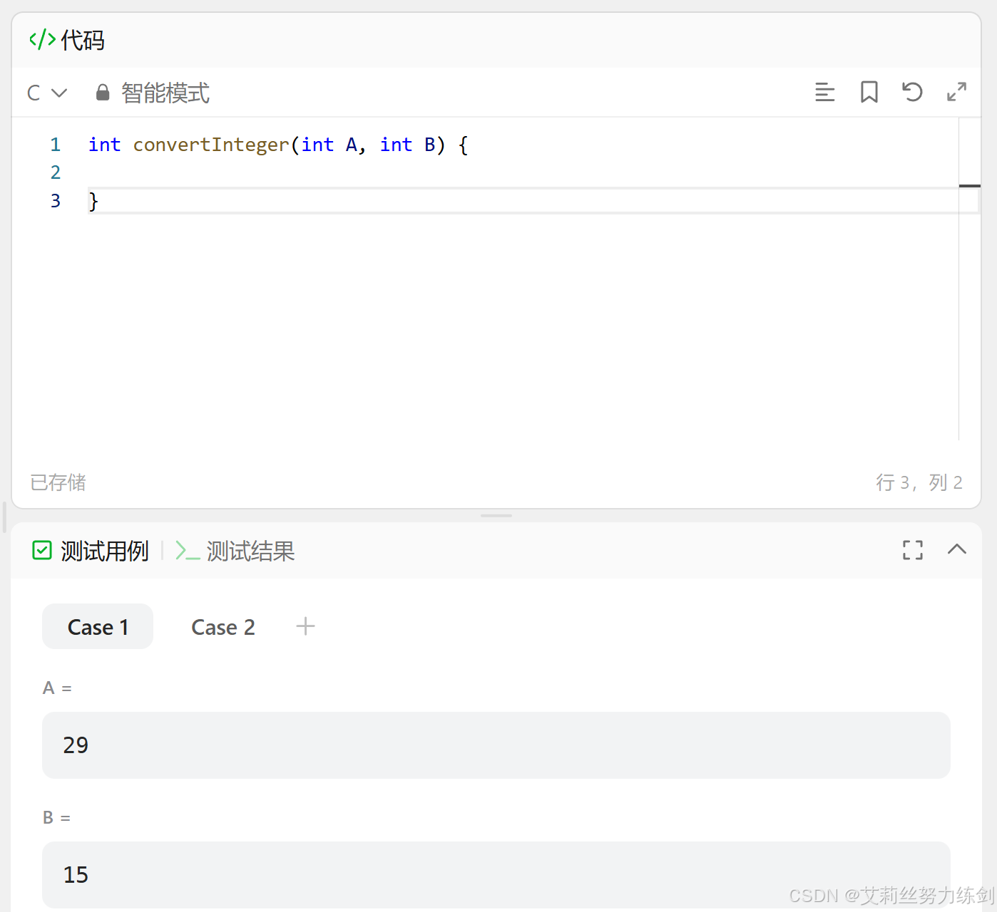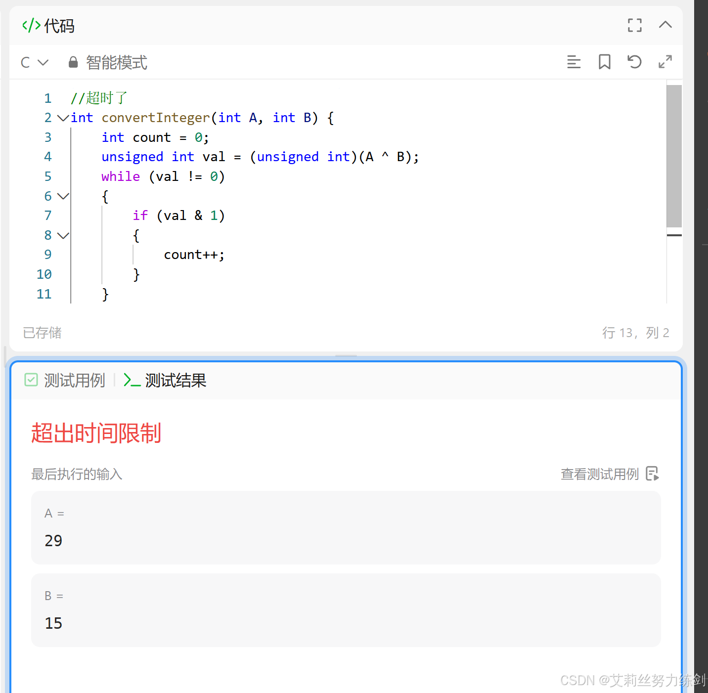 (1)异或操作:首先对A和B进行异或操作,得到一个整数C,其中每一个为1的位表示A和B在该位上不同。 (2)统计1的个数:然后统计C中1的个数,这个数就是需要改变的位数。 (3)处理负数:由于整数可能为负数,而C语言中负数的右移操作是算术右移(会填充符号位,1是负数符号位、0是正数符号位),这可能导致无限循环。因此,我们使用无符号整数来避免这个问题。具体来说,将异或结果转换为无符号整数后再进行位统计。
