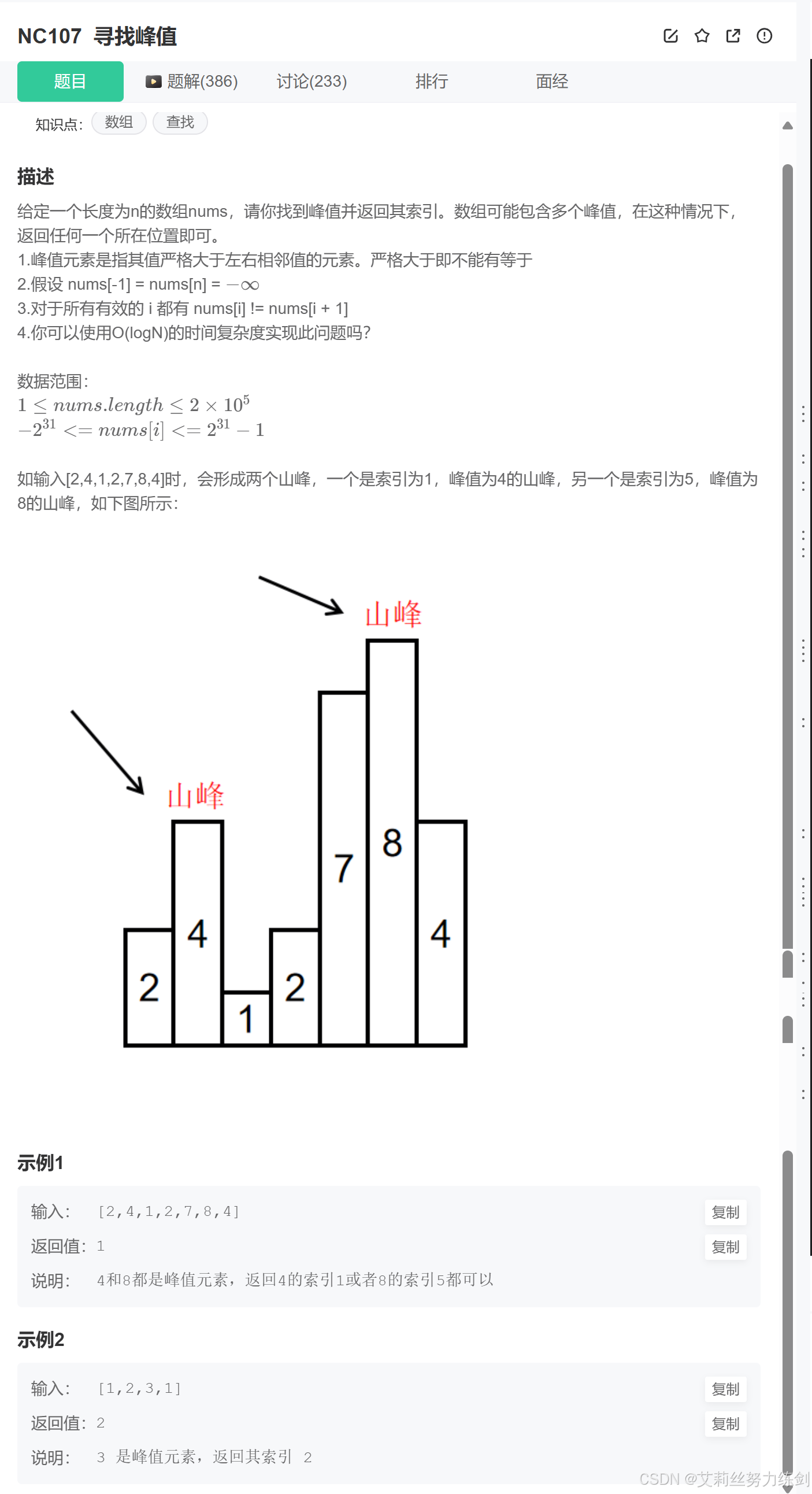 题目要求:需要在数组中找到任意一个峰值索引,要求时间复杂度 O(logN)。