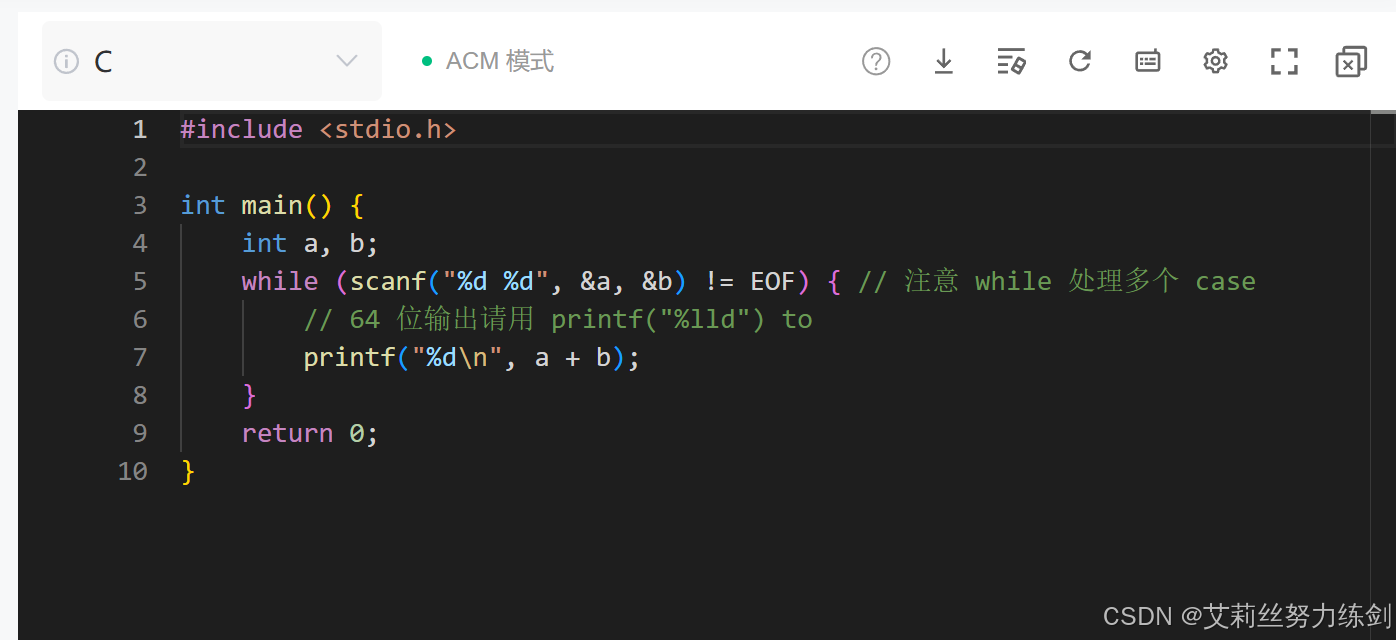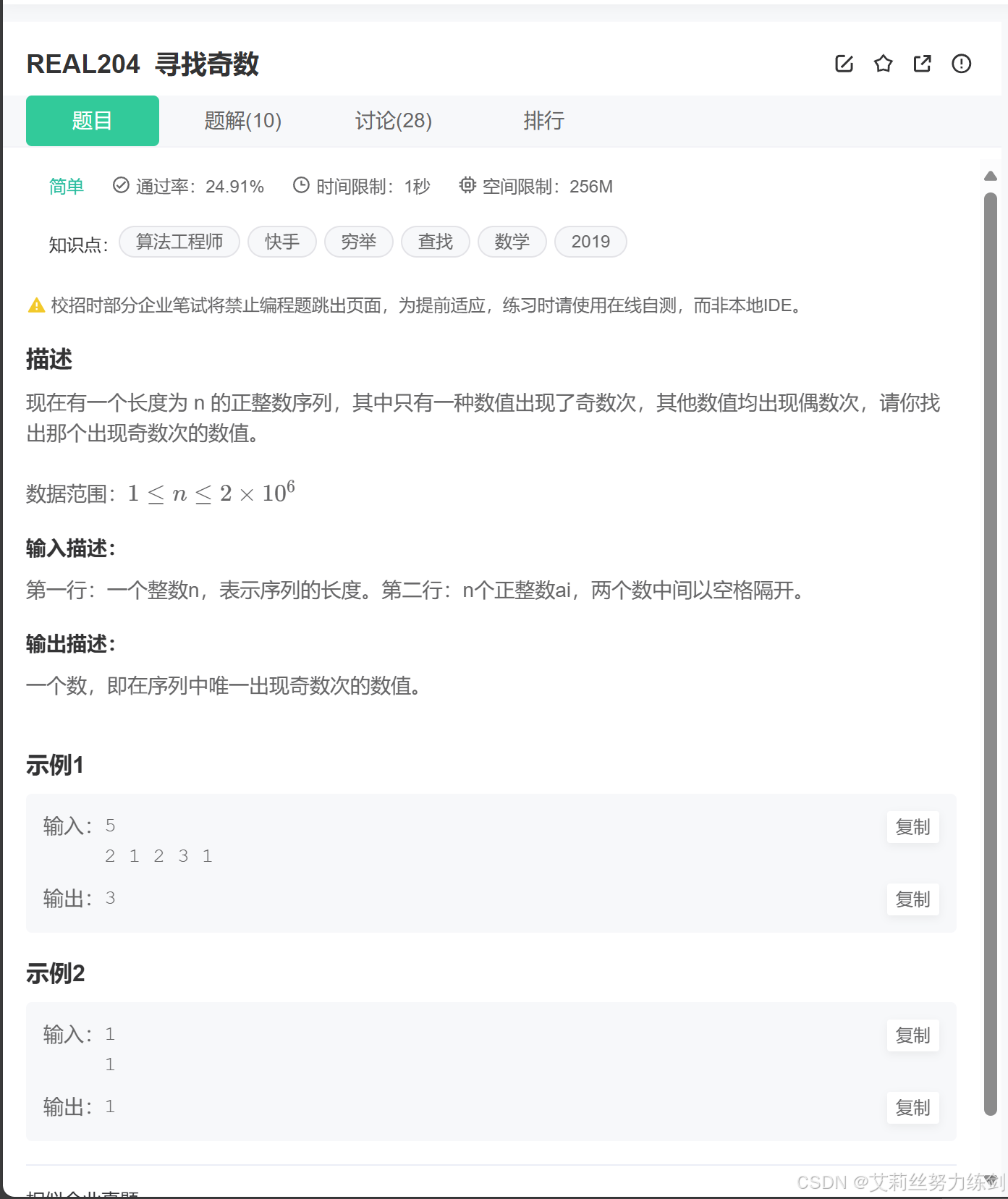 这道题是特殊输入,只要两个示例有一个通过,你手动输入能够通过的那个示例,就能过了,博主发现:C语言无论如何都只有一个示例——而且都是示例2——能够通过,其他示例都通不过,C++的实现倒是有两全其美的实现方式,但C语言博主做不到,所以博主C语言的每一种实现都会展示在【代码演示】,大家帮博主想想,有没有两全其美的实现方式?