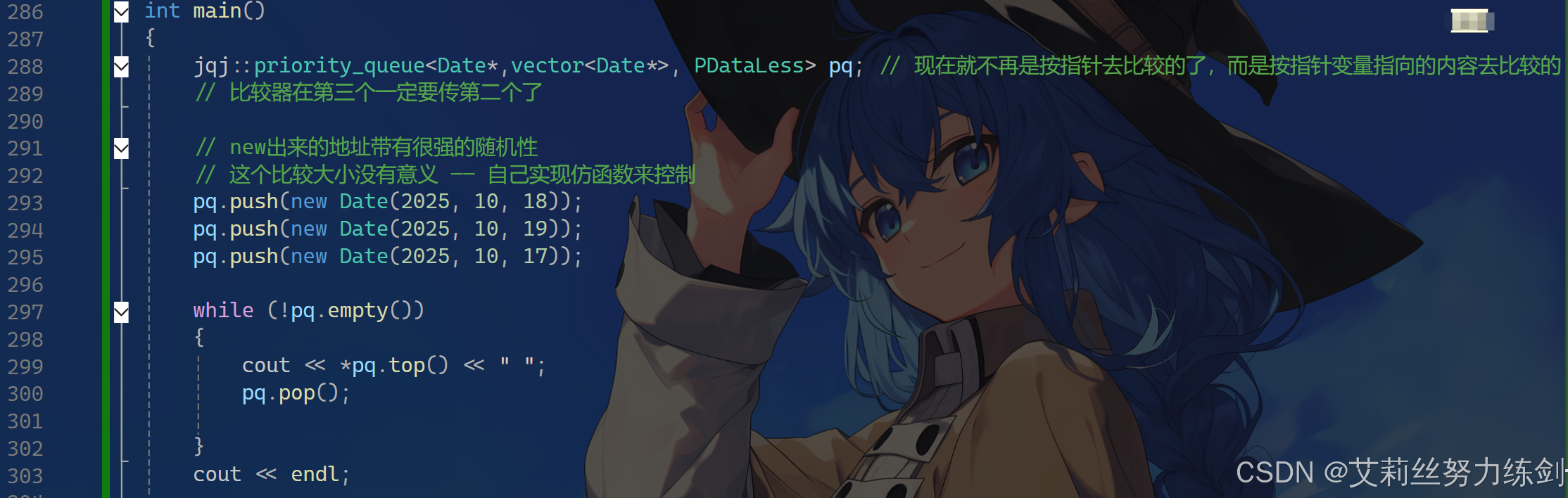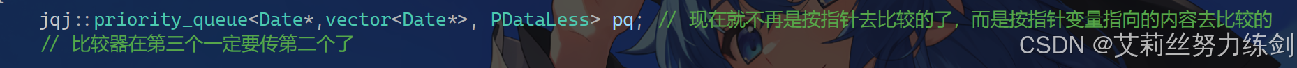 jqj::priority_queue<Date*,vector<Date*>, PDataLess> pq; // 现在就不再是按指针去比较的了,而是按指针变量指向的内容去比较的