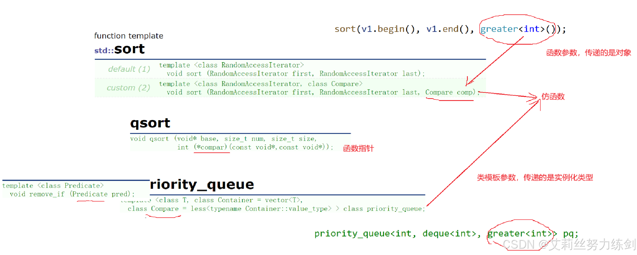 // 优先级队列那里是类模板参数,传递的是实例化类型