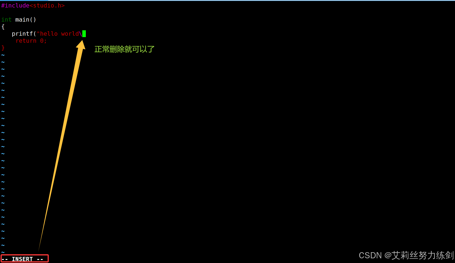5、也可以定位到某处,输入i(insert模式),正常删除就可以了