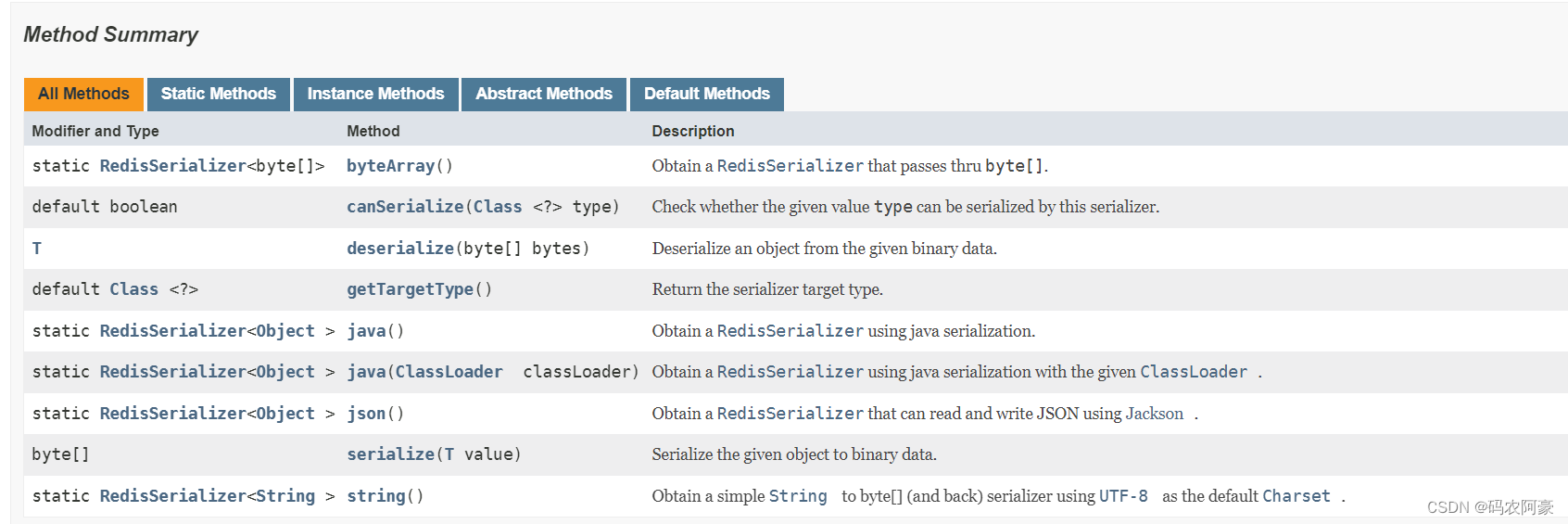 StringRedisTemplate继承自RedisTemplate类,实现了BeanClassLoaderAware,Aware,InitializingBean,RedisOperations<K, V>接口。StringRedisTemplate是RedisTemplate以字符串为中心的扩展,由于针对 Redis 的大多数操作都是基于字符串的,因此此类提供了一个专用类。StringRedisTemplate是默认采用的是String的序列化策略,保存的key和value都是采用此策略序列化保存的。# 7. RedisTemplate操作Hash类型