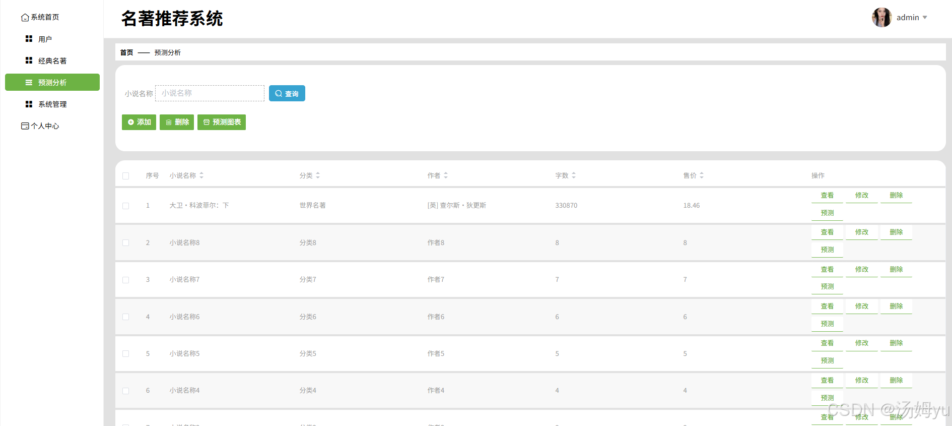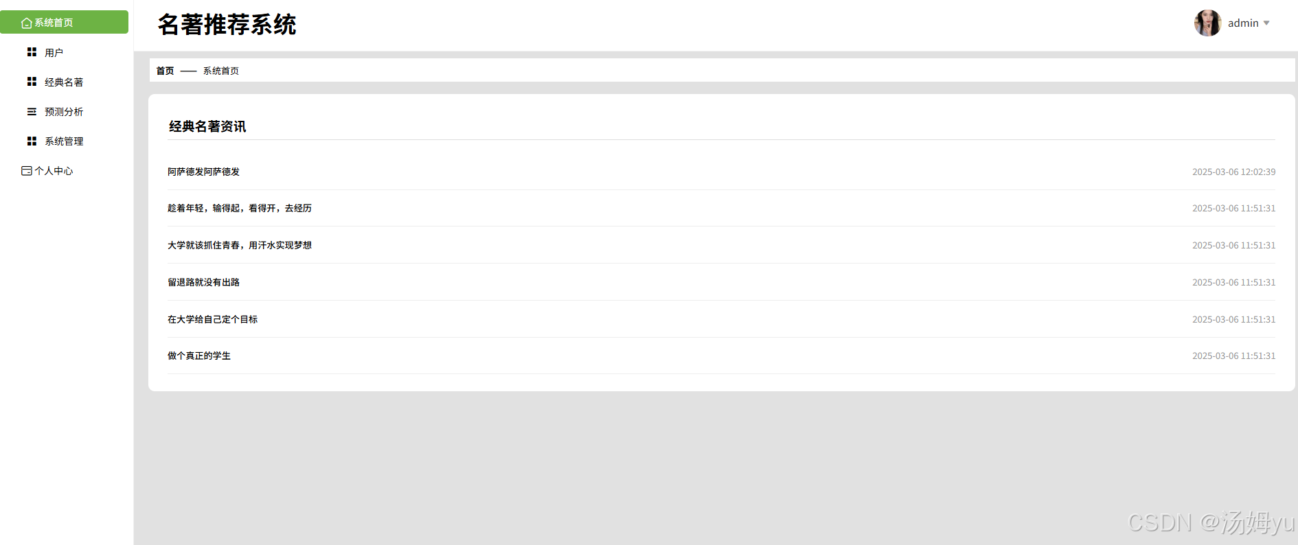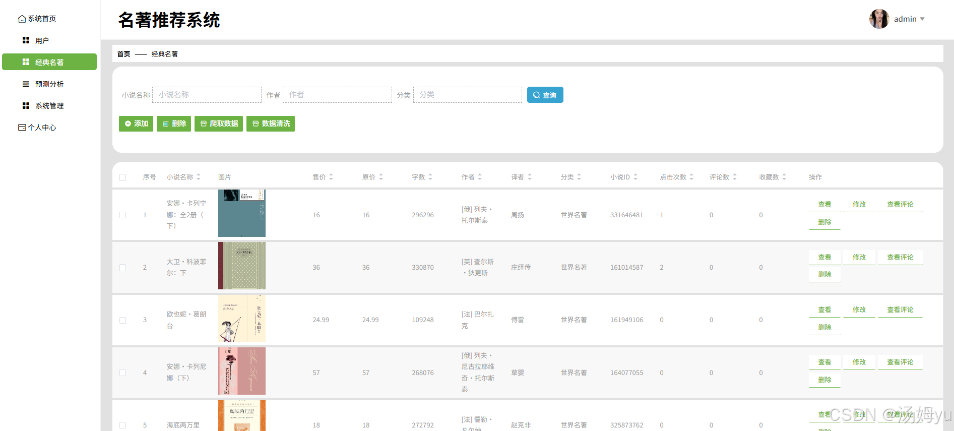 经典名著承载着丰富的文化内涵和历史价值,是人类文明的瑰宝。然而,由于信息传播的局限性,许多经典名著可能被埋没在海量资源中,难以被广泛认知和阅读。该推荐系统可以打破这种局限,通过智能推荐算法,将不同类型的经典名著精准推送给潜在读者,尤其是年轻一代。这有助于激发他们对经典文化的兴趣,促进经典文化的传承与传播,使经典名著在新时代焕发出新的活力。