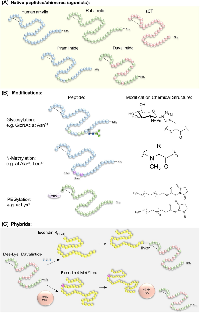 Amylin amide(DAP amide,AbMole,M10210)是由37个氨基酸残基组成的线性多肽,其C端以酰胺化形式存在,这一结构特征对维持其生物学活性至关重要,酰胺化修饰可增强多肽的结构稳定性,减少被羧肽酶降解的概率,同时提升其与受体的亲和力。Amylin的第20-29个氨基酸区域被认为是“淀粉样核心结构域”,该区域具有高度的疏水性,并且倾向于形成β折叠片结构。在生理条件下的缓冲液中,其可通过疏水相互作用和氢键相互结合,转变为富含β折叠的寡聚体,并最终组装成原纤维和成熟的淀粉样纤维[1]。在生物体内,Amylin amide的主要合成场所是胰岛β细胞。Amylin amide一般在葡萄糖、氨基酸等促分泌信号的刺激下,与胰岛素共表达于β细胞产生的分泌颗粒中,并与胰岛素以1:100-1:200的比例共同释放至血液循环。除胰岛β细胞外,在中枢神经系统(如下丘脑、脑干)的部分神经元中也检测到Amylin amide的表达,这些中枢来源的 Amylin amide可能通过旁分泌或自分泌方式参与食欲调控与能量平衡的调节。Amylin amide在血液中主要以游离形式存在。Amylin amide的受体主要是Calcitonin receptor(CTR)与RAMP 家族成员(主要为RAMP1、RAMP2、RAMP3)组成的异源二聚体,其中RAMP亚型是取决于受体细胞的组织特异性。当Amylin amide与受体结合后,可引起受体构象改变,激活胞内的G蛋白信号通路,包括Gαs/cAMP-PKA、Gαq/PLC-IP3/Ca²⁺等通路。