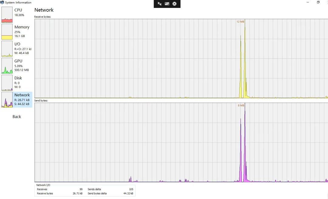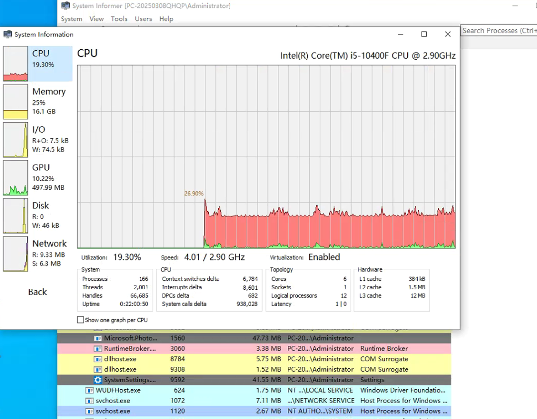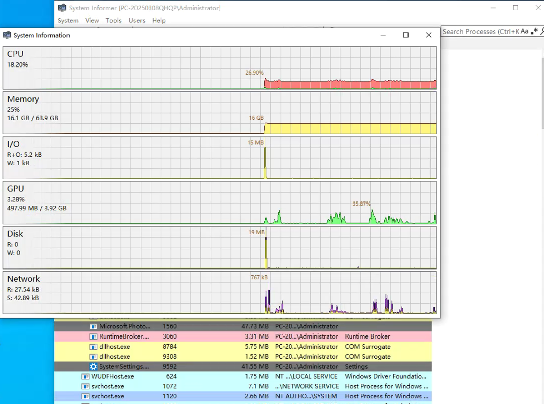 使用 Ctrl+I 查看系统性能信息。将光标悬停在图表上,获取光标下数据点的工具提示信息。您可以双击图表查看该数据点处的进程信息,即使进程已不再运行。如下所示: