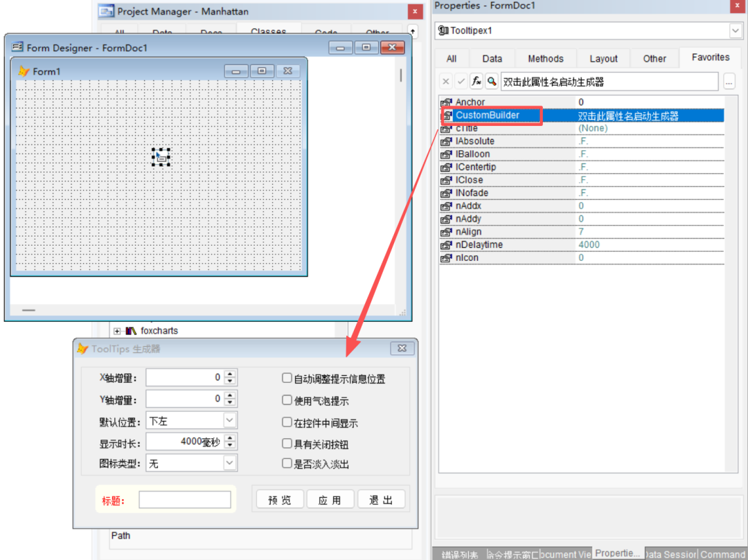 由于 ctl32_Balloontip 和 Screentip 在使用时略显复杂,因此框架的表单基类(myForm)封装了对它们的基本调用,使用时仅仅将其拖放至表单,并对需要应用的控件按照 VFP 的常规设计即可(也就是说,你仅仅需要在设计时指定控件的 ToolTipText 属性)。