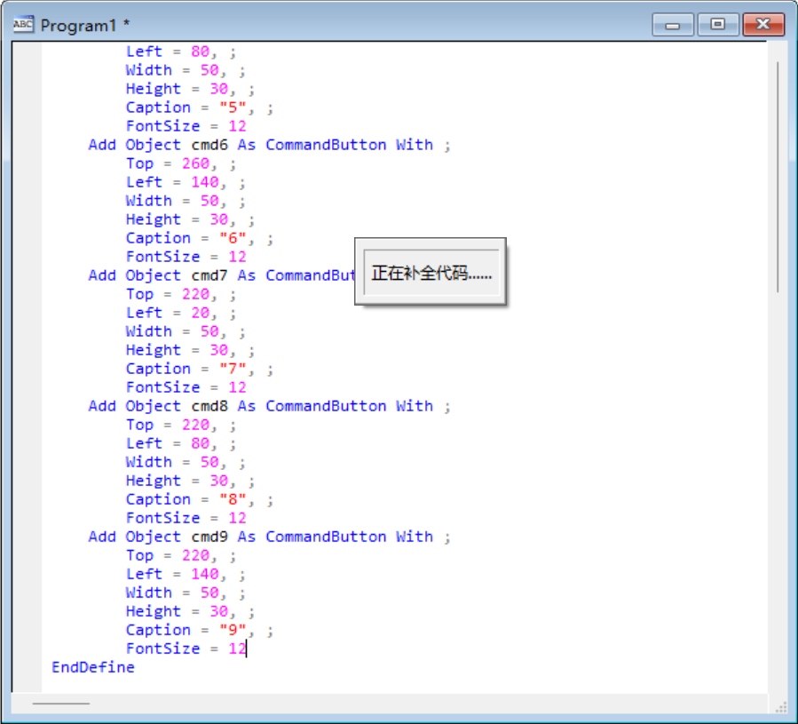 将光标置于 Form 这个单词之后,按 CTRL + P,即可开始进行代码补全: