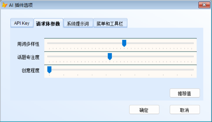 通过调整请求体参数控制 AI 的幻觉,建议在使用过程中,根据自己 对 AI 回复结果的判断进行适当调整。通常情况下,三项参数的值越小,幻觉越少: