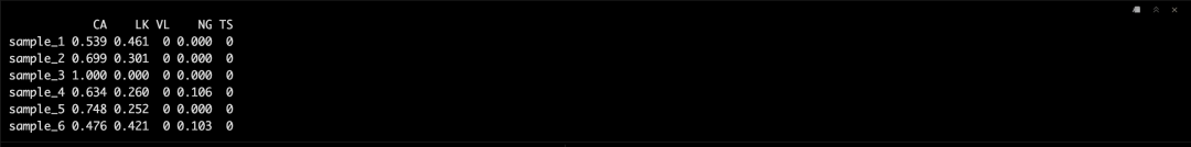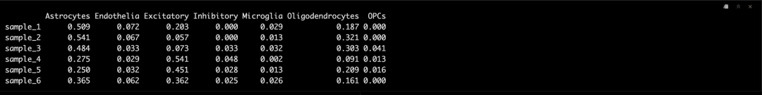 round(res.mixSQP$cellular_fraction[1:6,], 3)