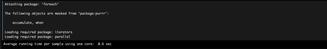 cat("Average running time per sample using one core: ",round((time.GIBBS*30)/(30*60),1), "min")