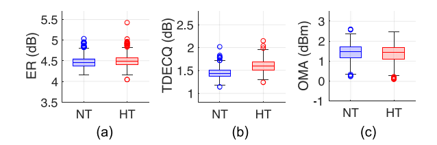 对于CPO系统中的512条链路,Meta表征了每条链路在常温与高温下的Tx性能,如下图所示。ER的典型值为4.5dB, 高温时会有些通道ER劣化为4dB,TDECQ的典型值为1.5dB, 高温时TDECQ会有所劣化,一些通道会达到2.2dB,OMA的典型值约为1.5dBm,较差的通道OMA也都在0dBm以上。所有通道的发端性能指标都满足400G-FR4的要求,并且有一定的margin。