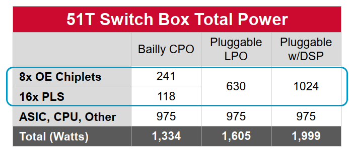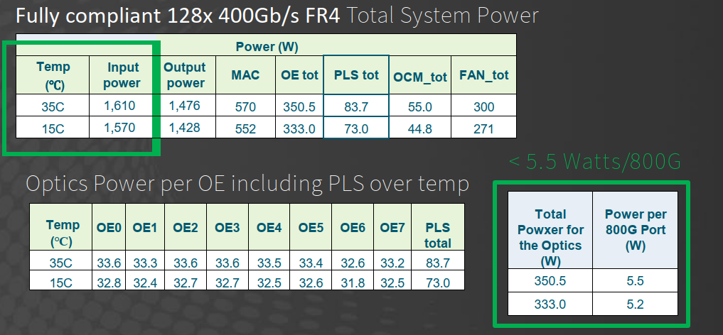 Meta的功耗测试结果,与Broadcom此前在OCP Summmit 2024公布的数据接近,800G光引擎的功耗也是在5.5W左右,如下表所示。