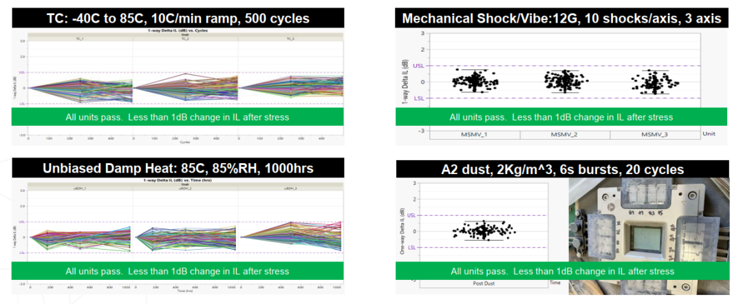 可插拔光连接器的可靠性测试,包括温循试验、高温高湿试验、机械振动试验和防尘试验。相关的测试结果如下图所示,结果显示光口插损的变化在±1dB以内,满足可靠性要求。