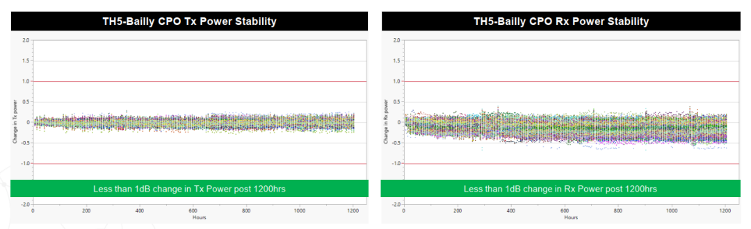 Broadcom此前在Lightcounting的研讨会中展示过所有链路Tx/Rx端的光功率变化量随时间的变化曲线,如下图所示,1200小时内光功率的变化小于1dB,非常稳定,并且通道间的一致性非常好。