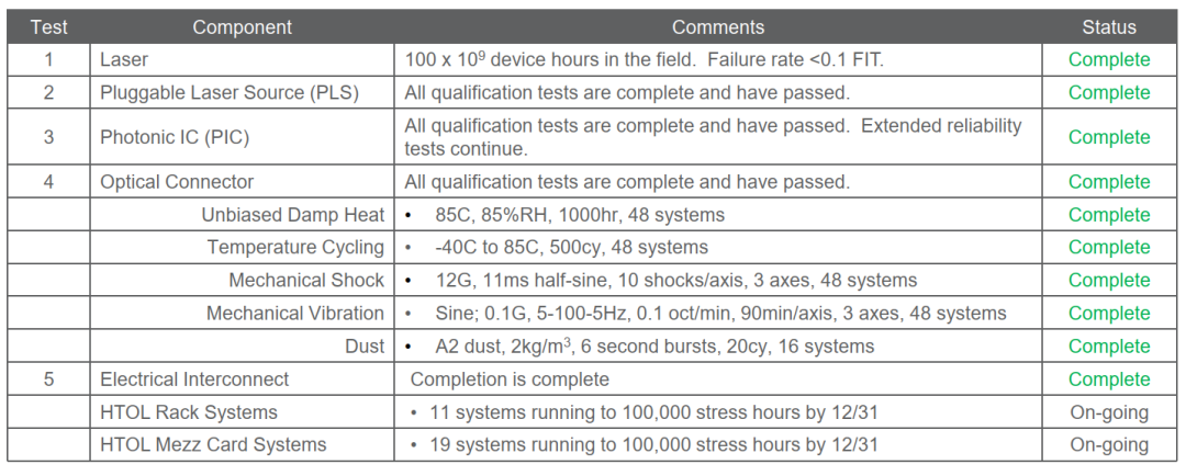 Broadcom此前在6月份的一次OCP webinar讨论中展示了其可靠性测试的进度,如下表所示。可靠性测试主要包含5大项,包括激光器芯片、可插拔激光器模块、PIC芯片、光连接器和电互联的可靠性。其中激光器相关的可靠性测试,Broadcom并没有展示具体的测试结果,只是说明进行了100亿小时的测试,激光器的FIT值小于0.1,通过了所有的相关可靠性测试。