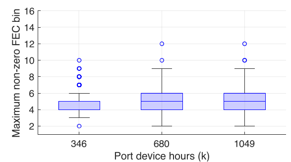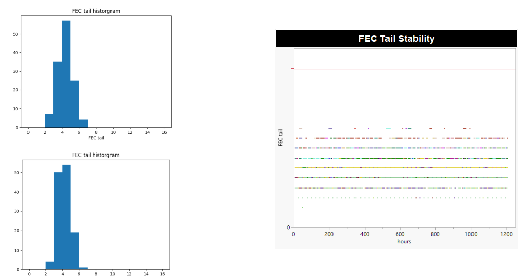 Meta也统计了不同时间内最大非零FEC bin的分布,如下图所示,一百万小时内(约42天)约75%的FEC bin数值小于7,只有一个FEC bin数值大于10,FEC tail是12。