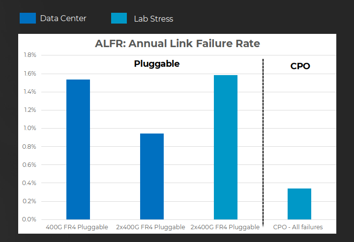 Meta方面还给出了光模块和CPO的年失效率和MTBF这两个数据的对比,如下图所示。ALFR对应annual link failure rate, MTBF对应meantime between failures,两者的换算关系为ALFR=1年/MTBF。从下表的数据中可以看出,CPO的ALFR值为0.34%,故障率约为可插拔光模块的五分之一。根据unserviceable failure的MTBF数据1500万小时,简单估算的话,CPO的FIT值约为67, 并不满足此前Nvidia大佬在OFC上提及的FIT<10的要求,看起来需要积攒更长时间的测试数据。此外根据Meta的评估,CPO的MTBF数据证明其可以支持24K张GPU构成的AI集群以90%的训练效率工作。