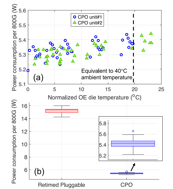 Meta测试了不同温度下800G光引擎的功耗,通过改变服务器机柜内的风扇角度,可以改变光引擎的环境温度。功耗的数值在5.2-5.5W之间,对应的能效比为6.9pJ/bit。作为对比,不同vendor家的FR4*2光模块的功耗在15mW左右,采用CPO后,功耗降低了65%。而与LPO方案相比,CPO方案节省约35%功耗。对于单个51.2T交换机系统,采用CPO方案后,可以节省650W的功耗。