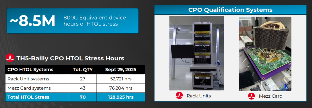Broadcom还分别在测试板和板卡上进行了高温工作寿命实验(HTOL),两种情况下累计的测试时间达到12万小时,等效于800G光模块测试了850万小时。