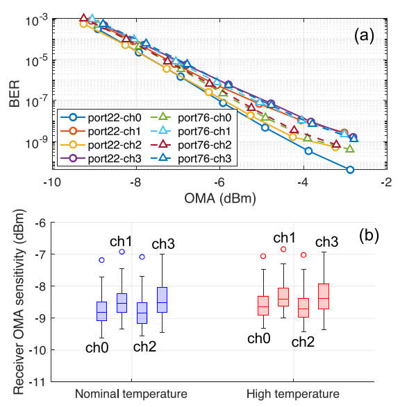 Meta随机选择了两个Port的Rx进行了表征,采用一个400G FR4的光模块作为发端,其ER为5dB,TDECQ为2dB。Rx测的灵敏度在-8.5dBm左右。512个通道的BER均小于5e-8。