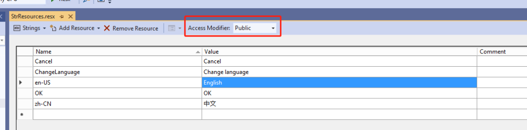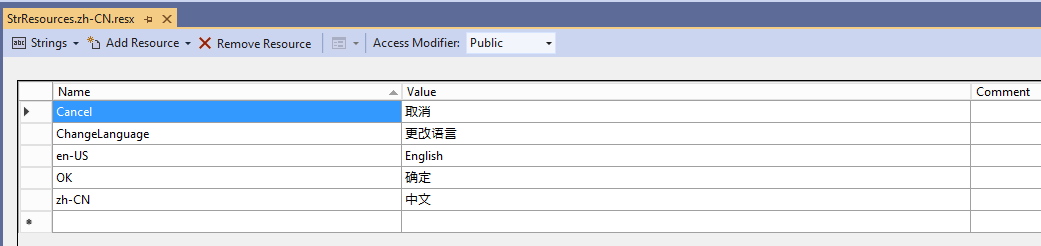 创建一个WPF工程,添加一个字符资源文件StrResources.resx作为默认的字符资源文件,再添加一个StrResources.zh-CN.resx做为中文字符资源(因为我用于演示的这台电脑系统是英文的)