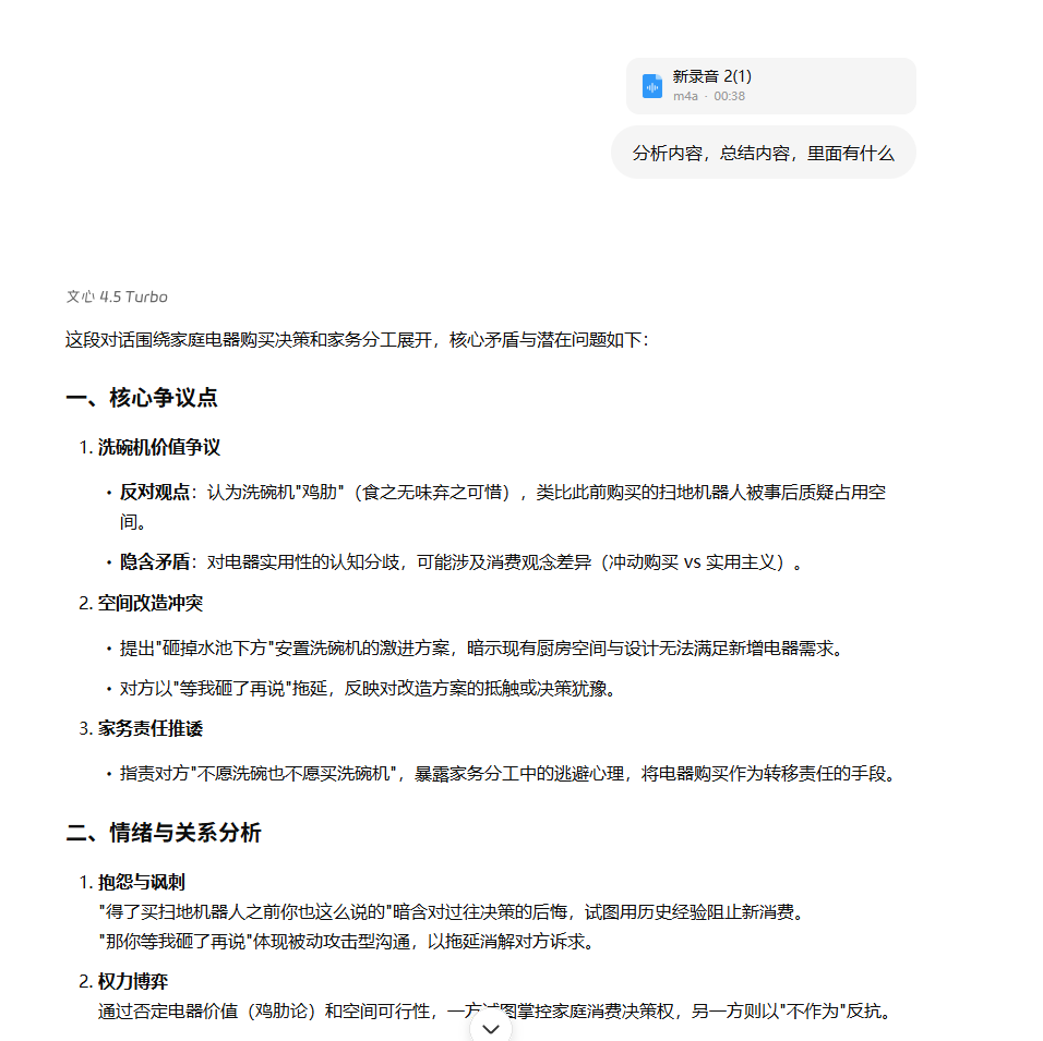 文心5.0生成的内容不仅完整复现了音频中的信息,还精准提炼出核心要点,在分析问题的同时,更对整体情绪倾向做出了细腻到位的解读。